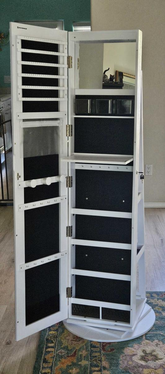 Keep your jewelry organized and secure with this lockable, multi-functional cabinet. The 3-in-1 design adds style and convenience, making it an ideal addition to any room.